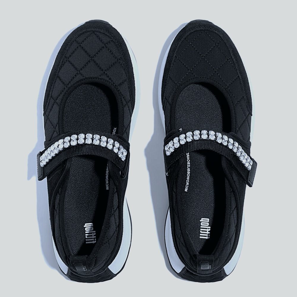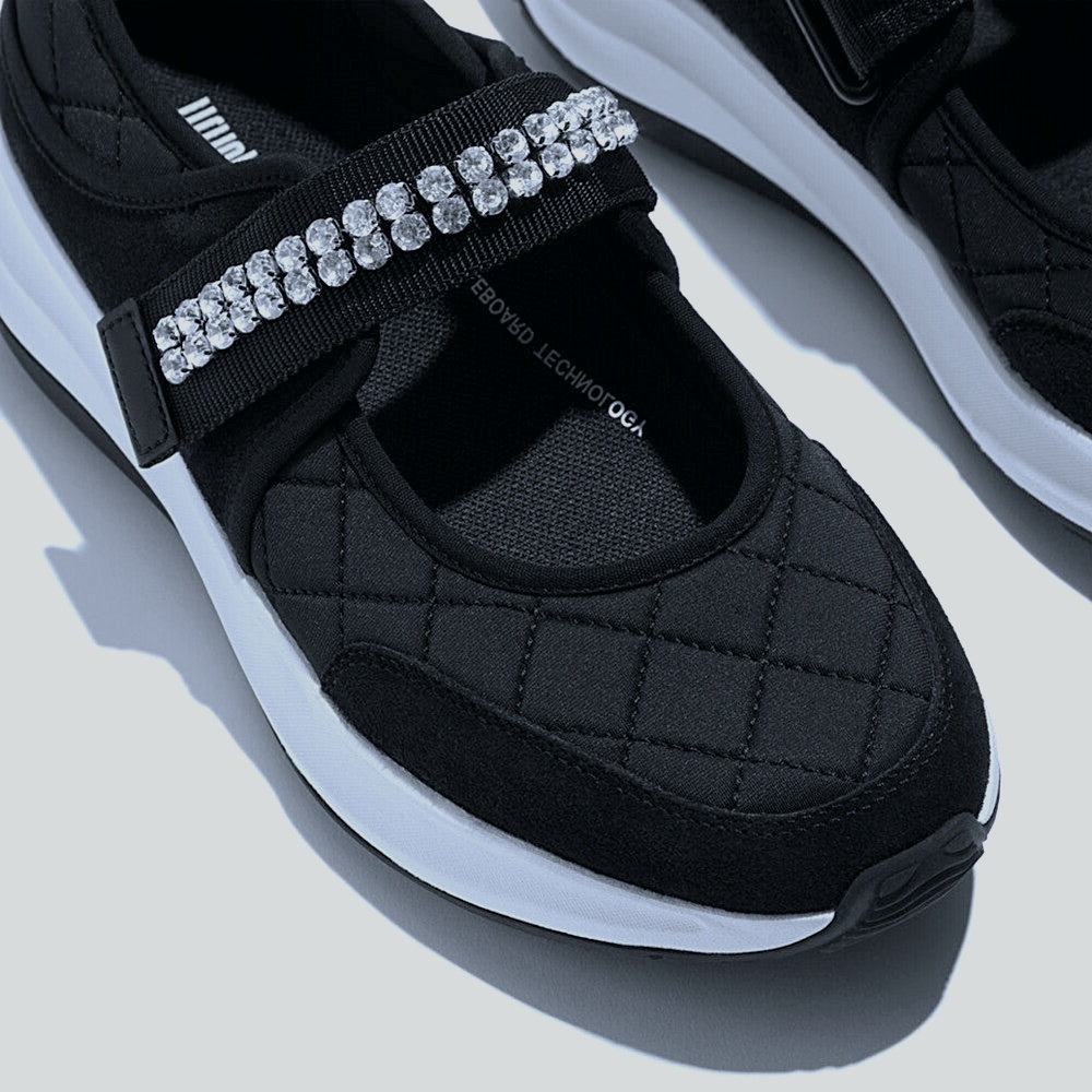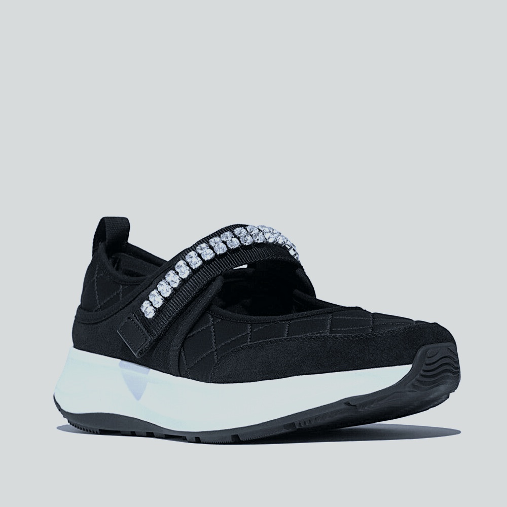 Sport-sleek Mary Jane with a quilted SoftShield upper and an elastic strap crowned by a SparkleLine bar. CloudGlide platform midsole diffuses pressure and keeps transitions smooth. Cushioned heel cup and padded collar hold the fit; breathable lining prevents hot spots. Micro-grip rubber outsole delivers steady traction. Finished in deep onyx black.