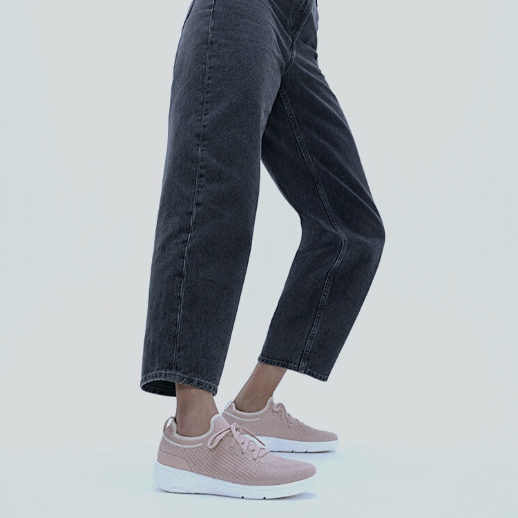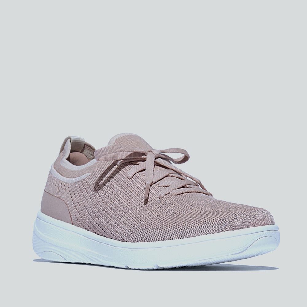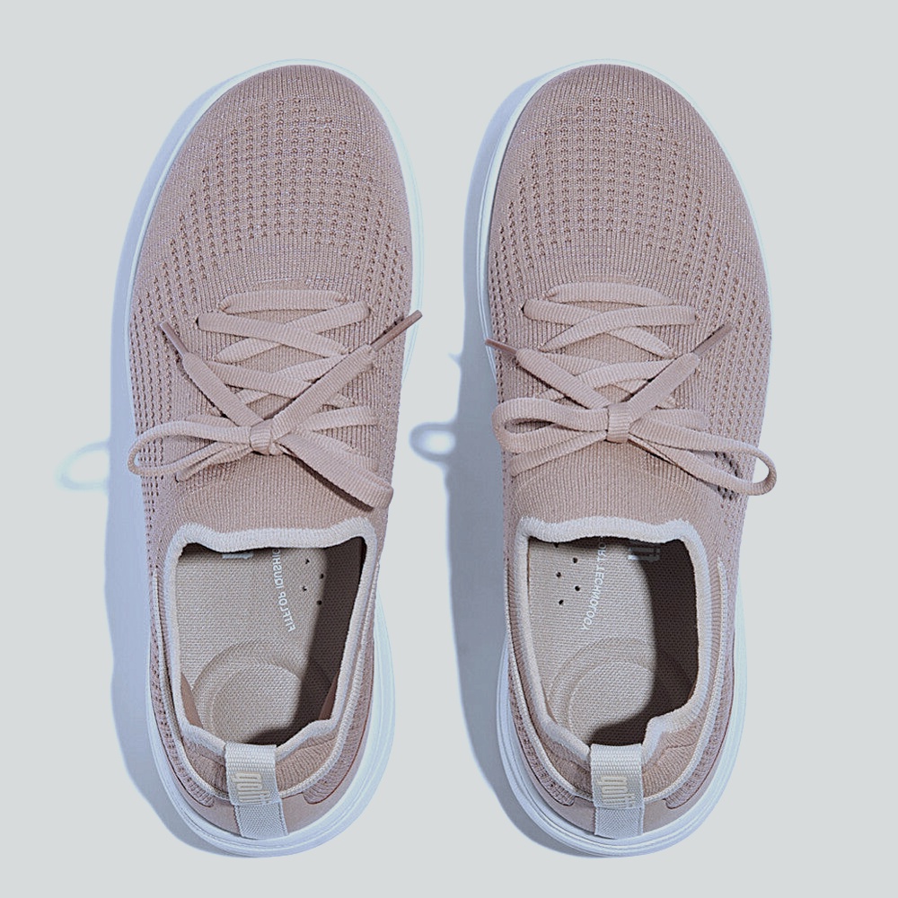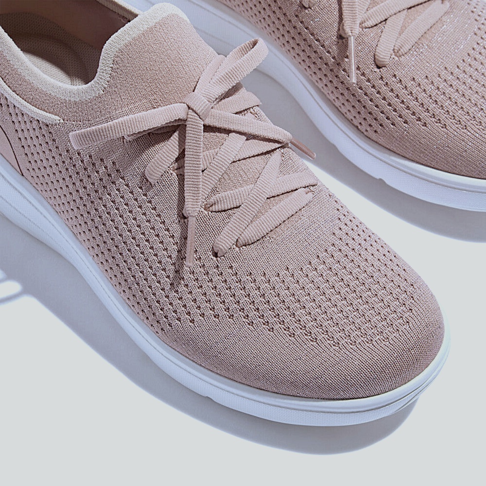 Featherweight lace-up with a BreezeWeave sock-fit upper that flexes and breathes. CloudGlide midsole disperses pressure and keeps the stride smooth through long days. Padded collar and heel loop for easy on/off; micro-perfs along the vamp boost airflow. Grippy rubber pods underfoot deliver steady traction. Finished in beige buff with a soft rose-gold glow.